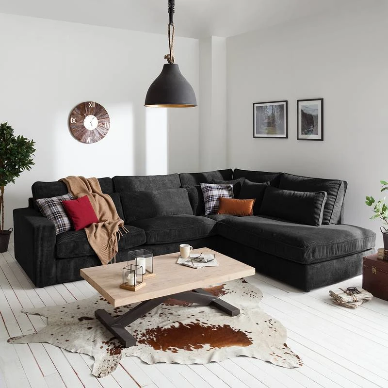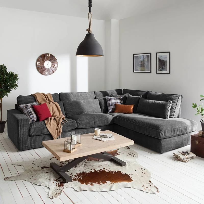 - Contenu de la livraison : canapé d’angle avec 3 coussins de dossiers et 3 coussins d’appoint, sans décoration